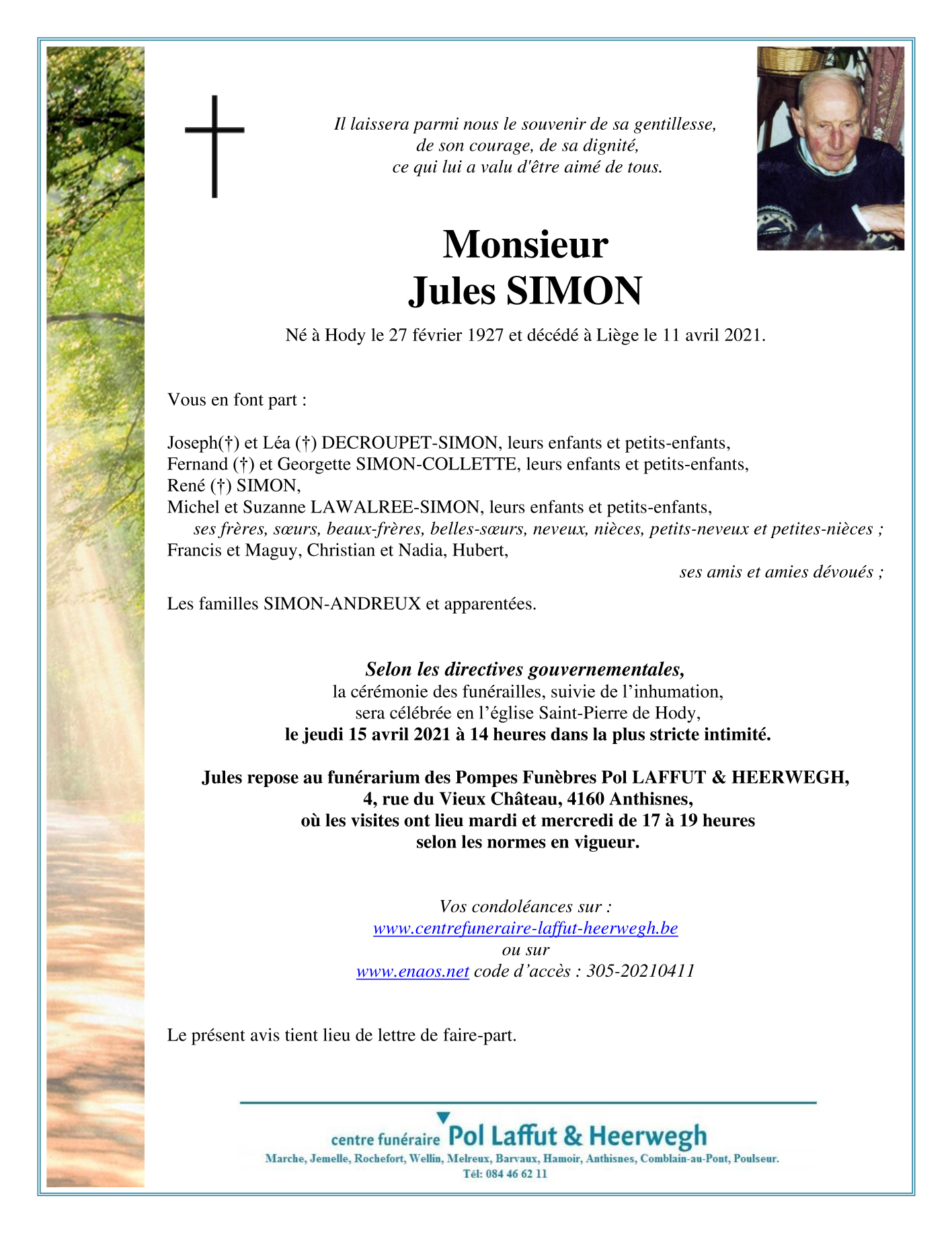 Décédé à Liège (4000) le dimanche 11 avril 2021 à l'âge de 94 ans