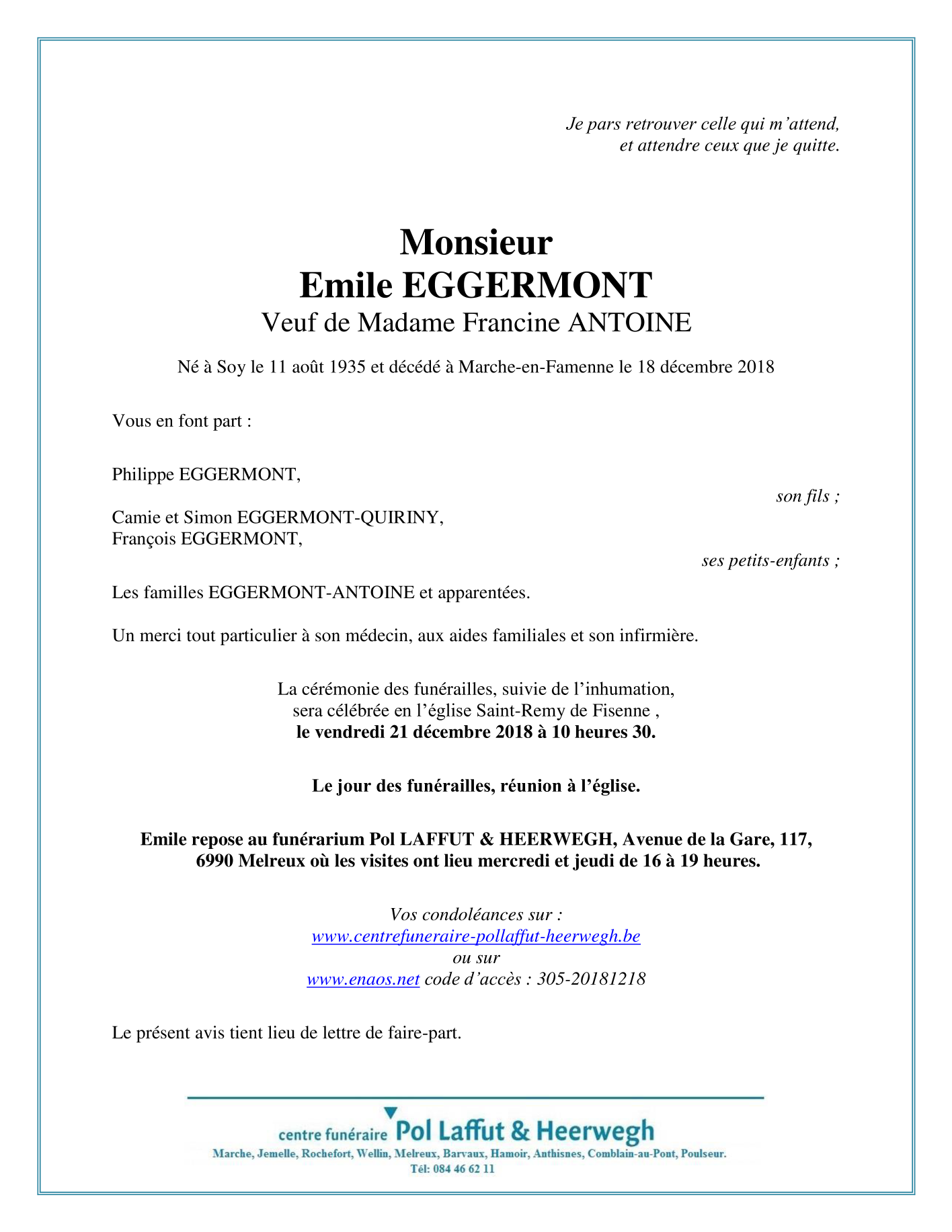 Décédé à Marche-en-Famenne (6900) le mardi 18 décembre 2018 à l'âge de 83 ans