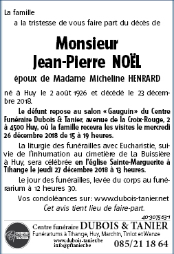 Décédé à Waremme (4300) le dimanche 23 décembre 2018 à l'âge de 92 ans