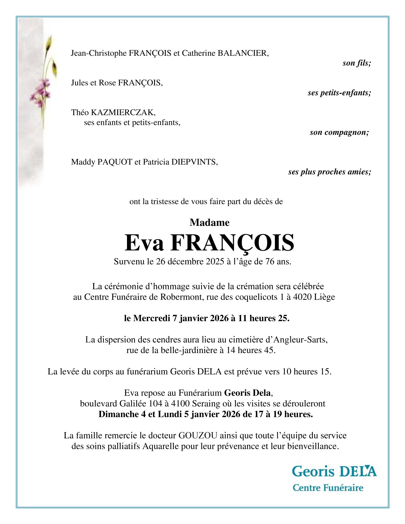 Décédée à Waremme (4300) le vendredi 26 décembre 2025 à l'âge de 76 ans
