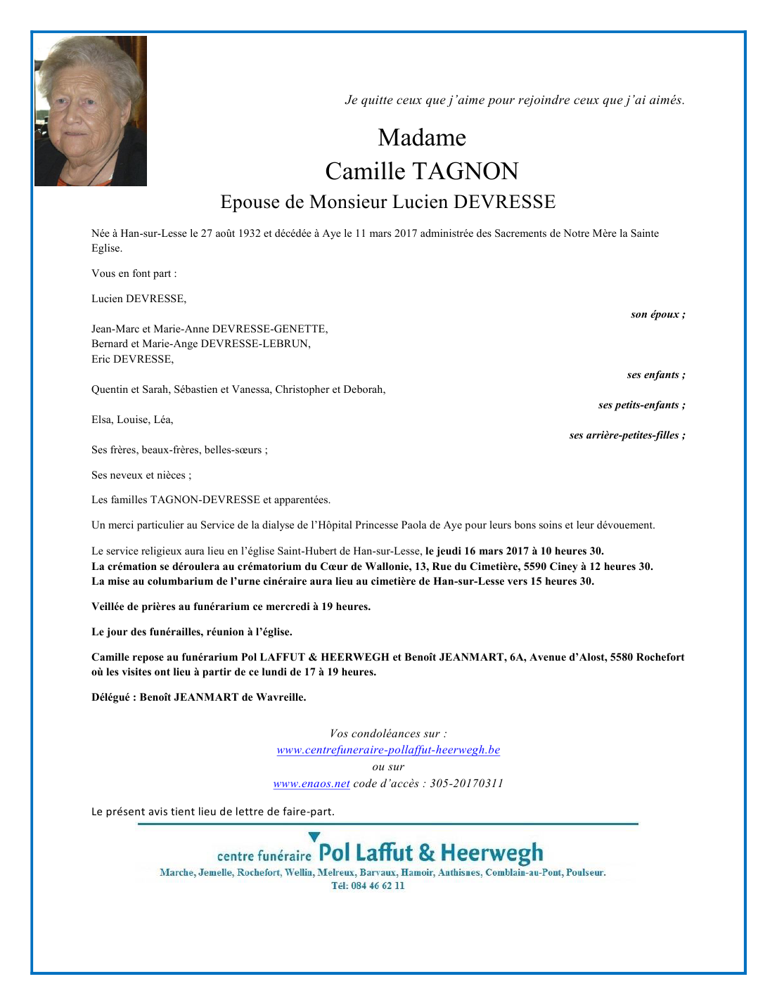 Fallecida en Aye (6900) el sábado, 11 de marzo de 2017 a la edad de 84 años