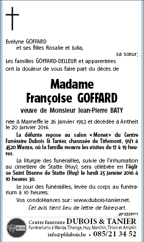 Overleden te Antheit (4520) op woensdag 20 januari 2016 op 62-jarige leeftijd