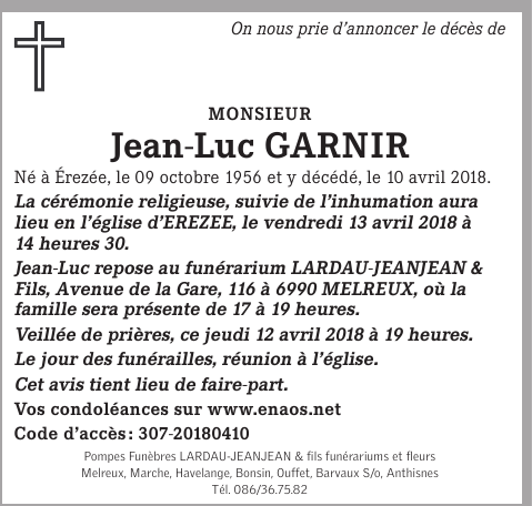 Décédé à Erezée (6997) le mardi 10 avril 2018 à l'âge de 61 ans