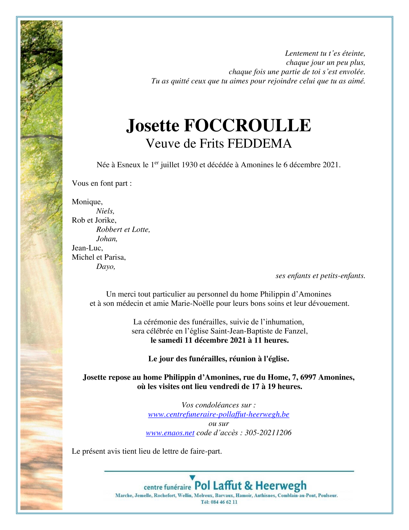 Décédée à Amonines (6997) le lundi 6 décembre 2021 à l'âge de 91 ans