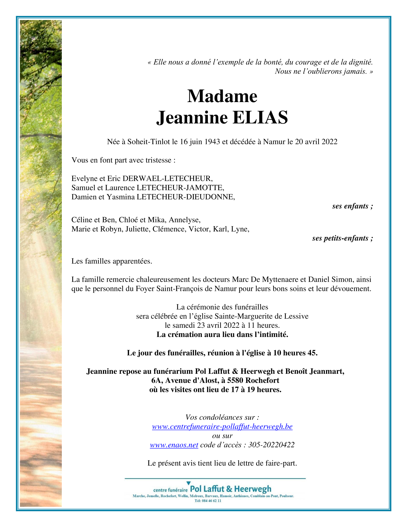 Died in Namur (5000) on 20 April 2022 at the age of 78 years