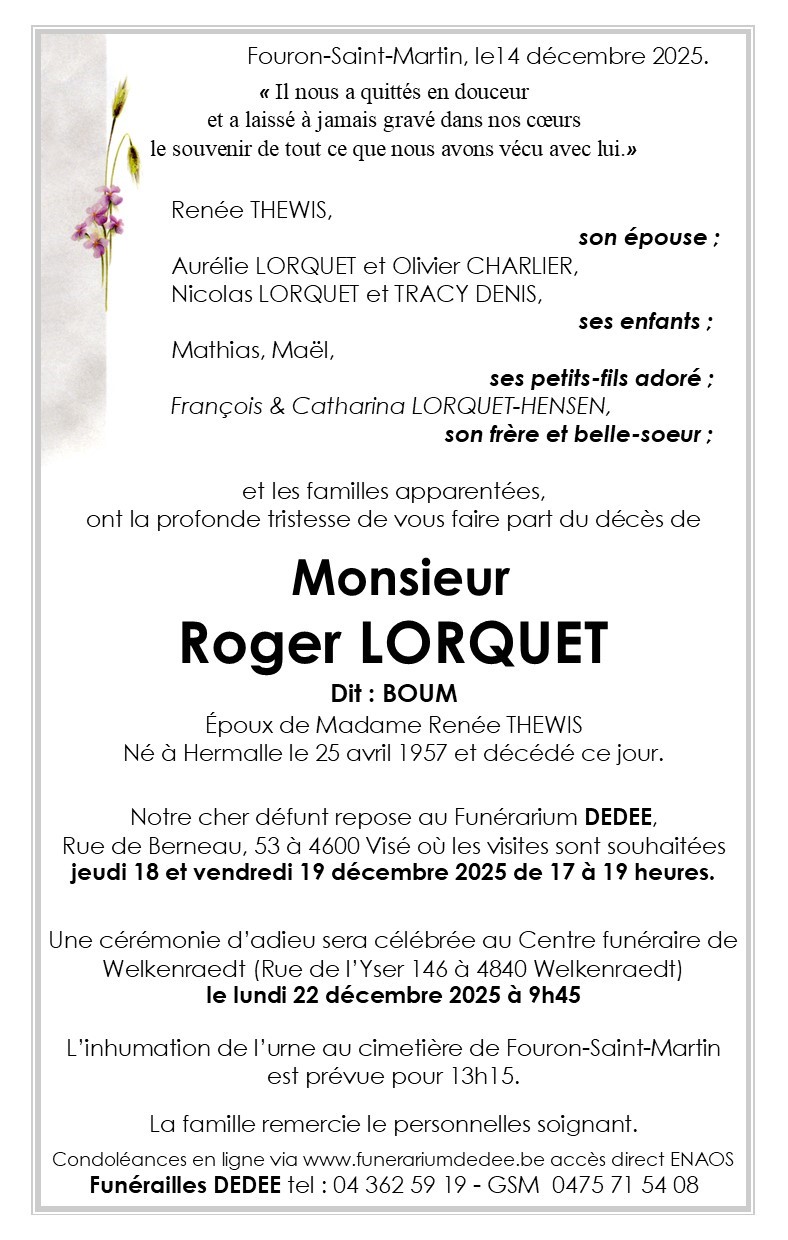 Décédé à Hermalle-sous-Argenteau (4681) le dimanche 14 décembre 2025 à l'âge de 68 ans