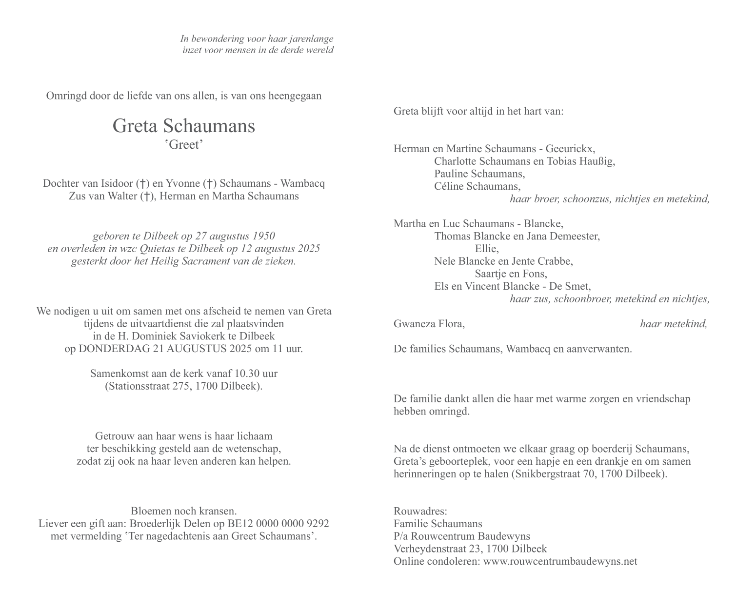 Décédée à Dilbeek (1700) le mardi 12 août 2025 à l'âge de 74 ans