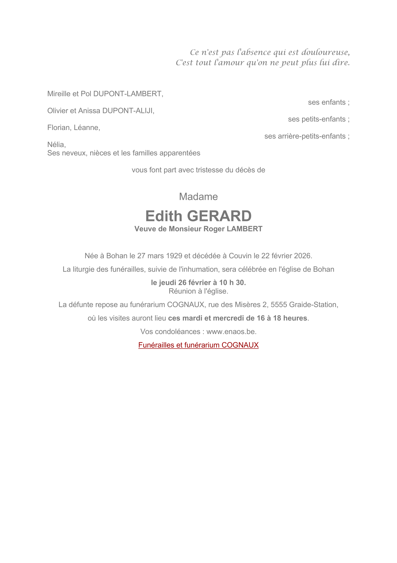 Décédée à Couvin (5660) le dimanche 22 février 2026 à l'âge de 96 ans