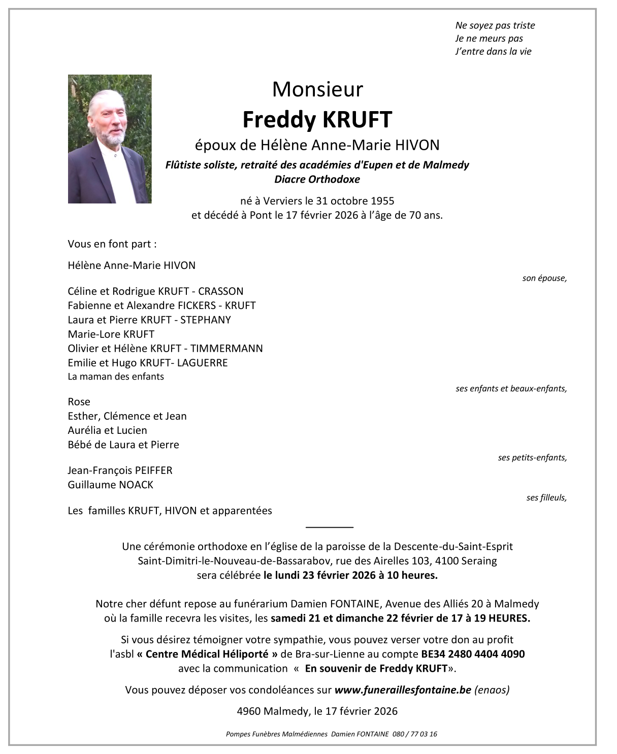 Décédé à Pont (4960) le mardi 17 février 2026 à l'âge de 70 ans