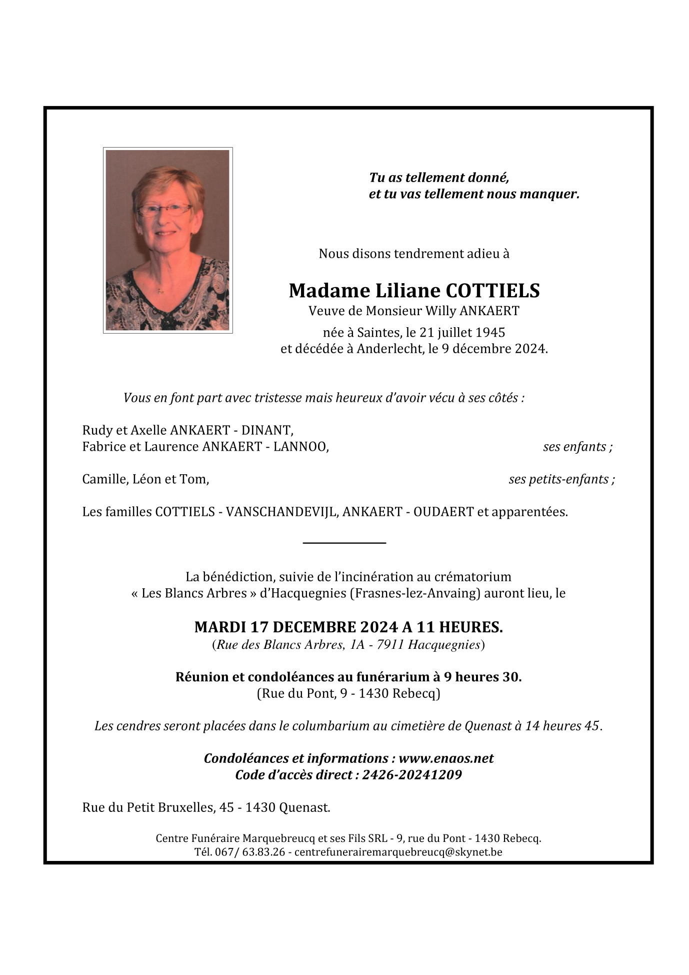 Fallecida en Anderlecht (1070) el lunes, 9 de diciembre de 2024 a la edad de 79 años