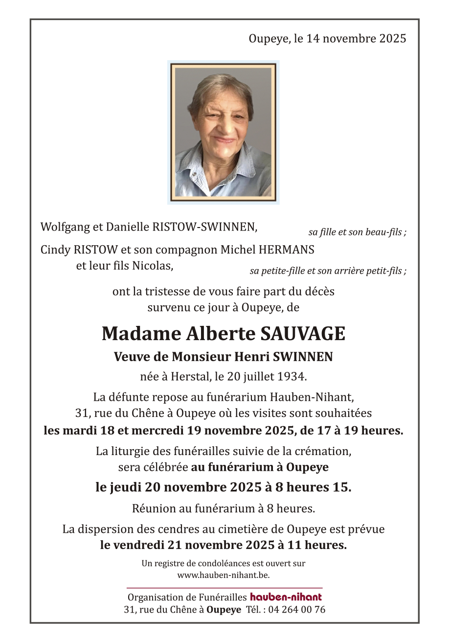 Décédée à Oupeye (4680) le vendredi 14 novembre 2025 à l'âge de 91 ans