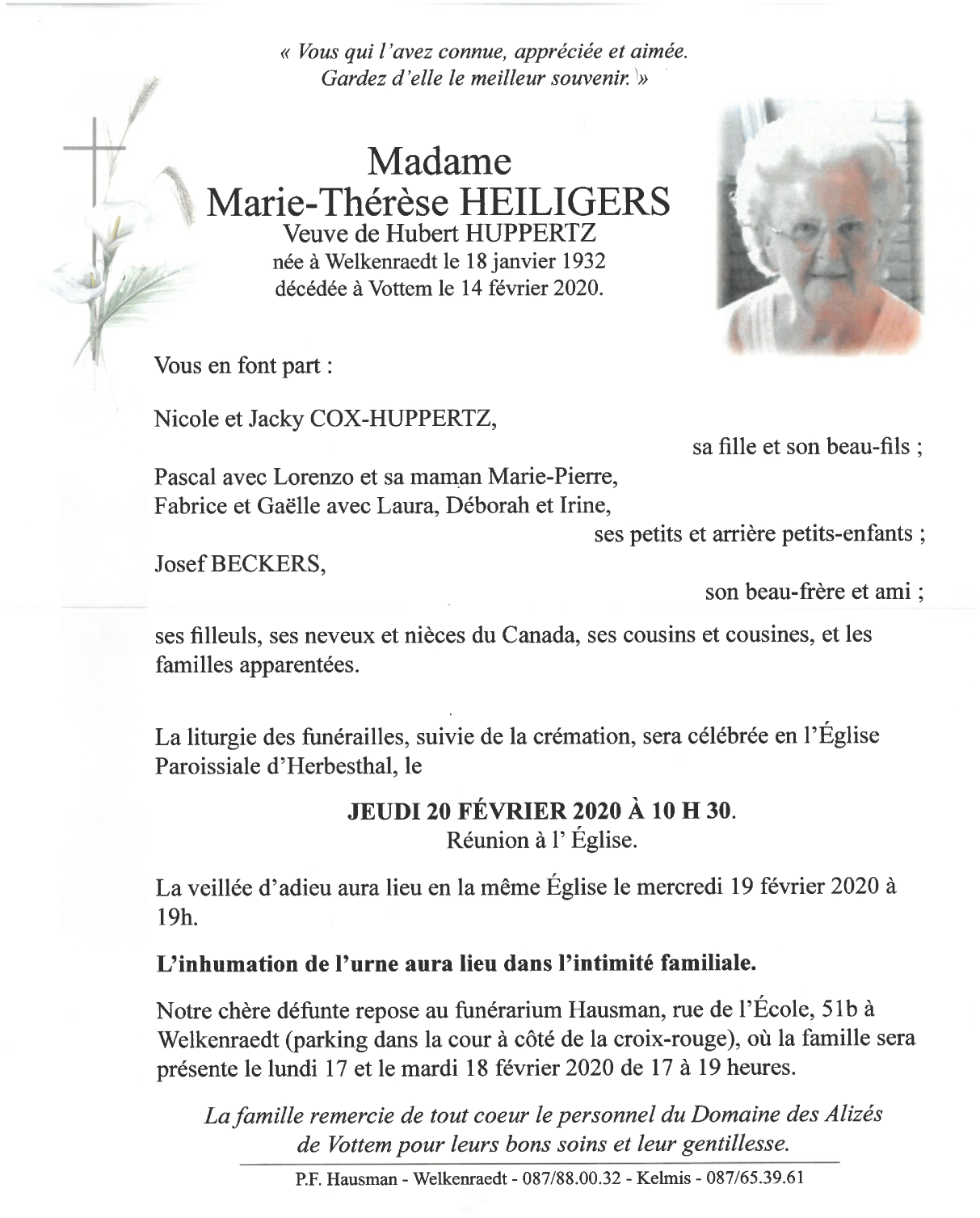 Overleden te Vottem (4041) op vrijdag 14 februari 2020 op 88-jarige leeftijd
