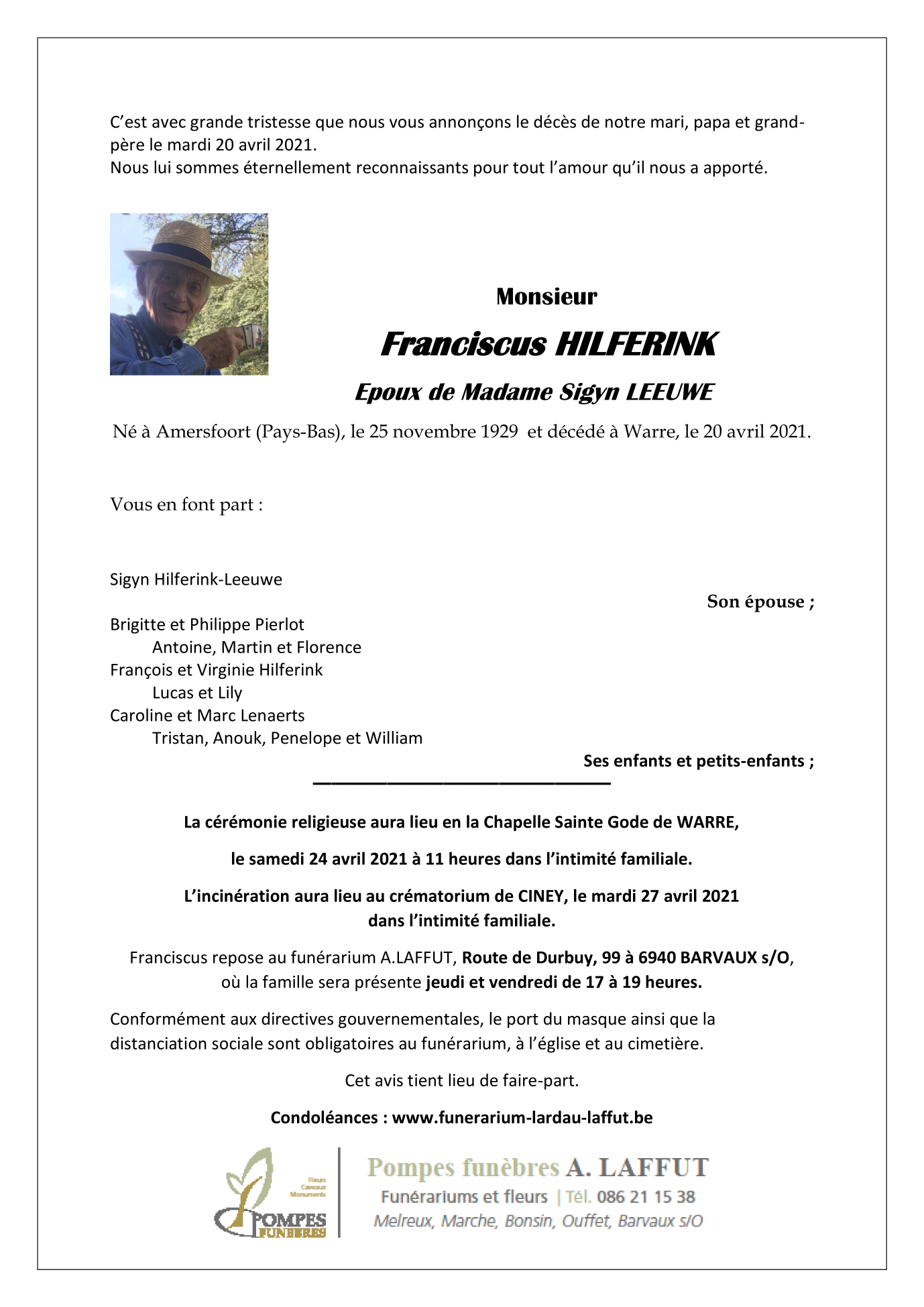 Fallecido en Warre (6941) el martes, 20 de abril de 2021 a la edad de 91 años