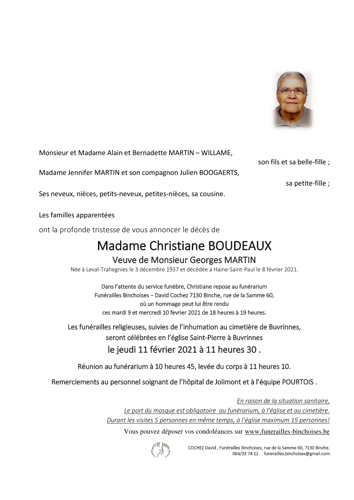 Fallecida en La Louvière (7100) el lunes, 8 de febrero de 2021 a la edad de 83 años