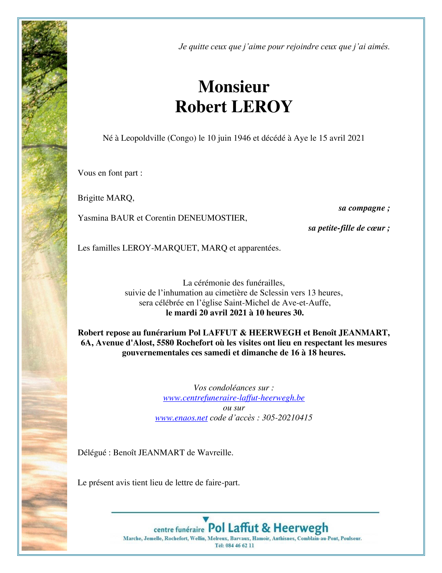 Overleden te Aye (6900) op donderdag 15 april 2021 op 74-jarige leeftijd