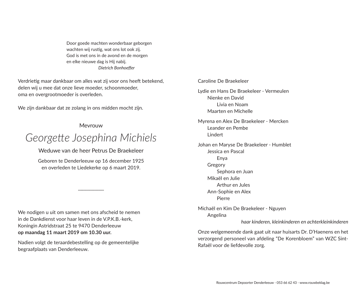 Overleden te Liedekerke (1770) op woensdag 6 maart 2019 op 93-jarige leeftijd