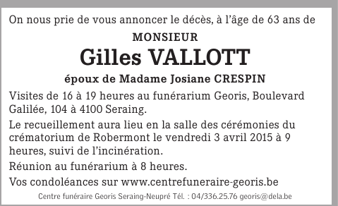 Décédé à Seraing (4100) le mardi 31 mars 2015 à l'âge de 63 ans