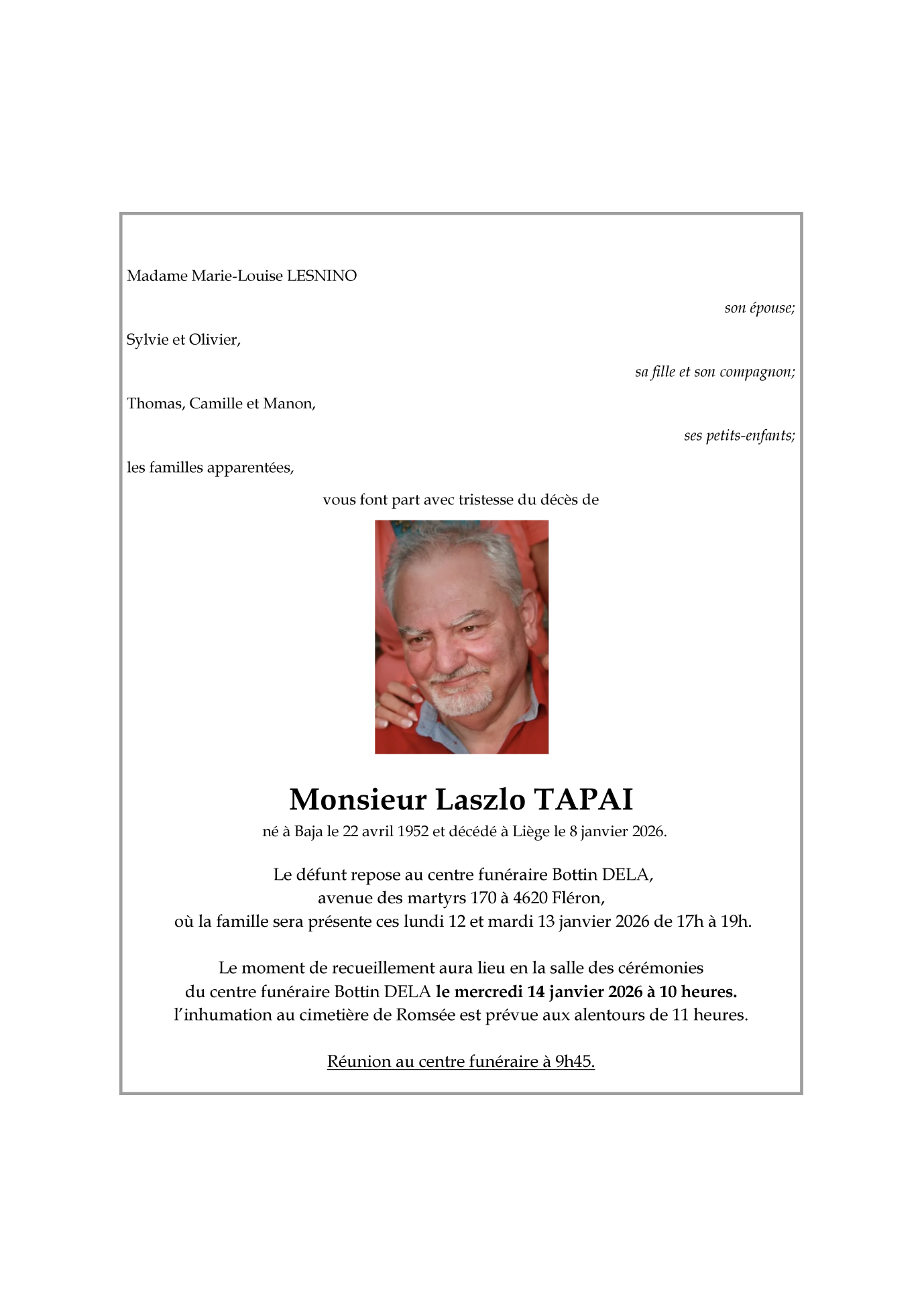 Décédé à Liège (4000) le jeudi 8 janvier 2026 à l'âge de 73 ans