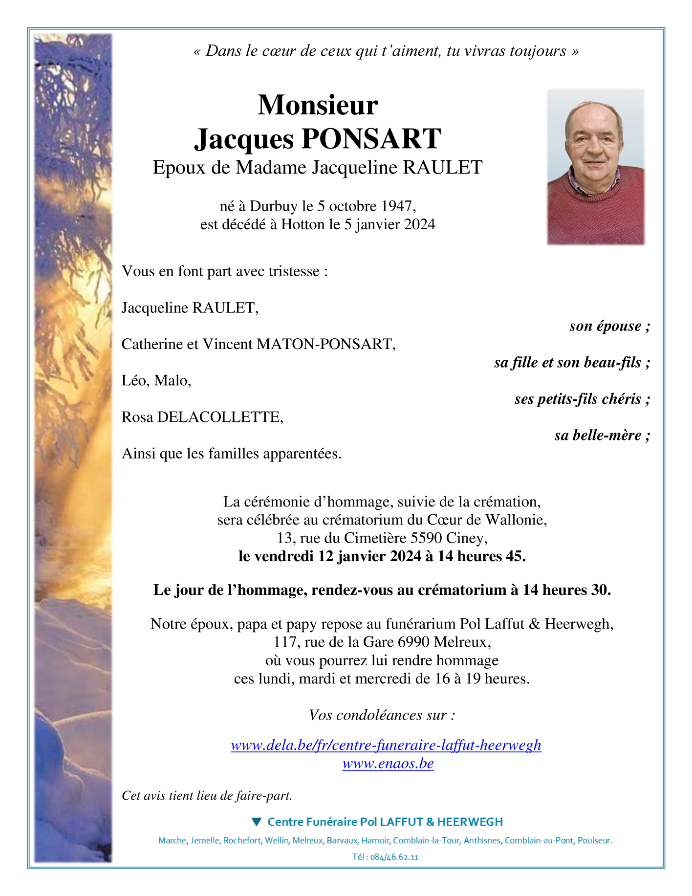 Died in Hotton (6990) on 05 January 2024 at the age of 76 years