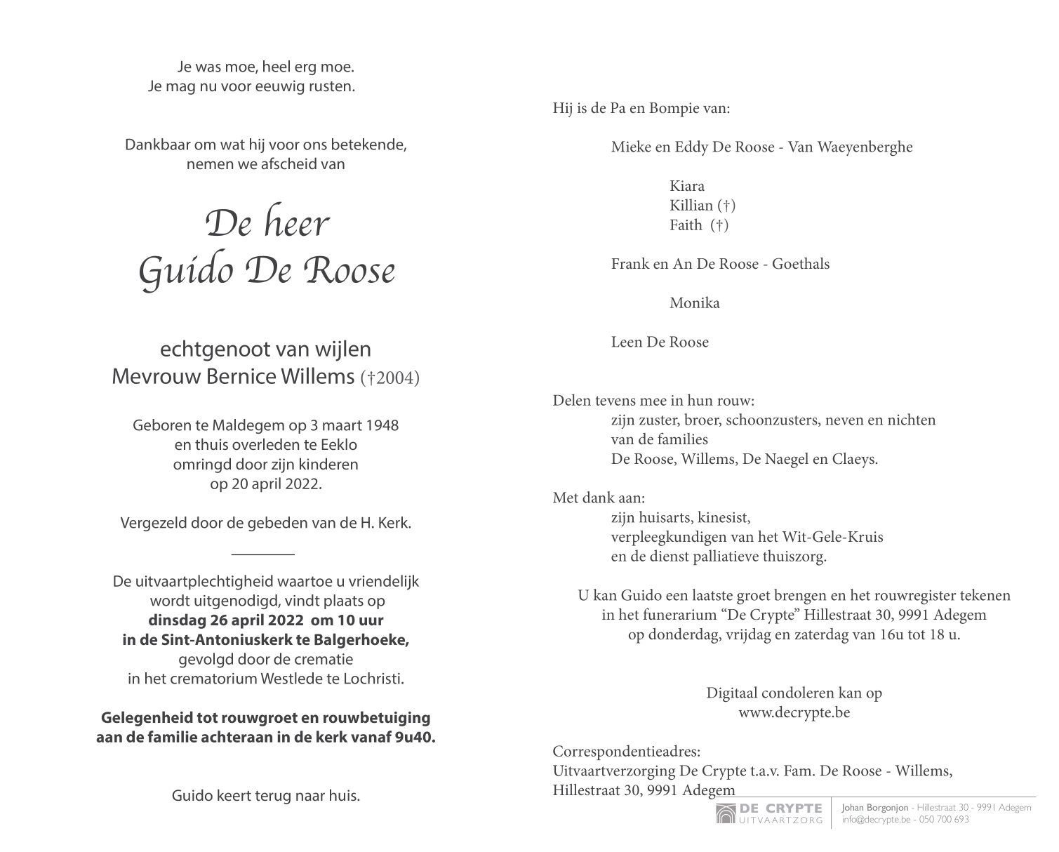 Overleden te Eeklo (9900) op woensdag 20 april 2022 op 74-jarige leeftijd