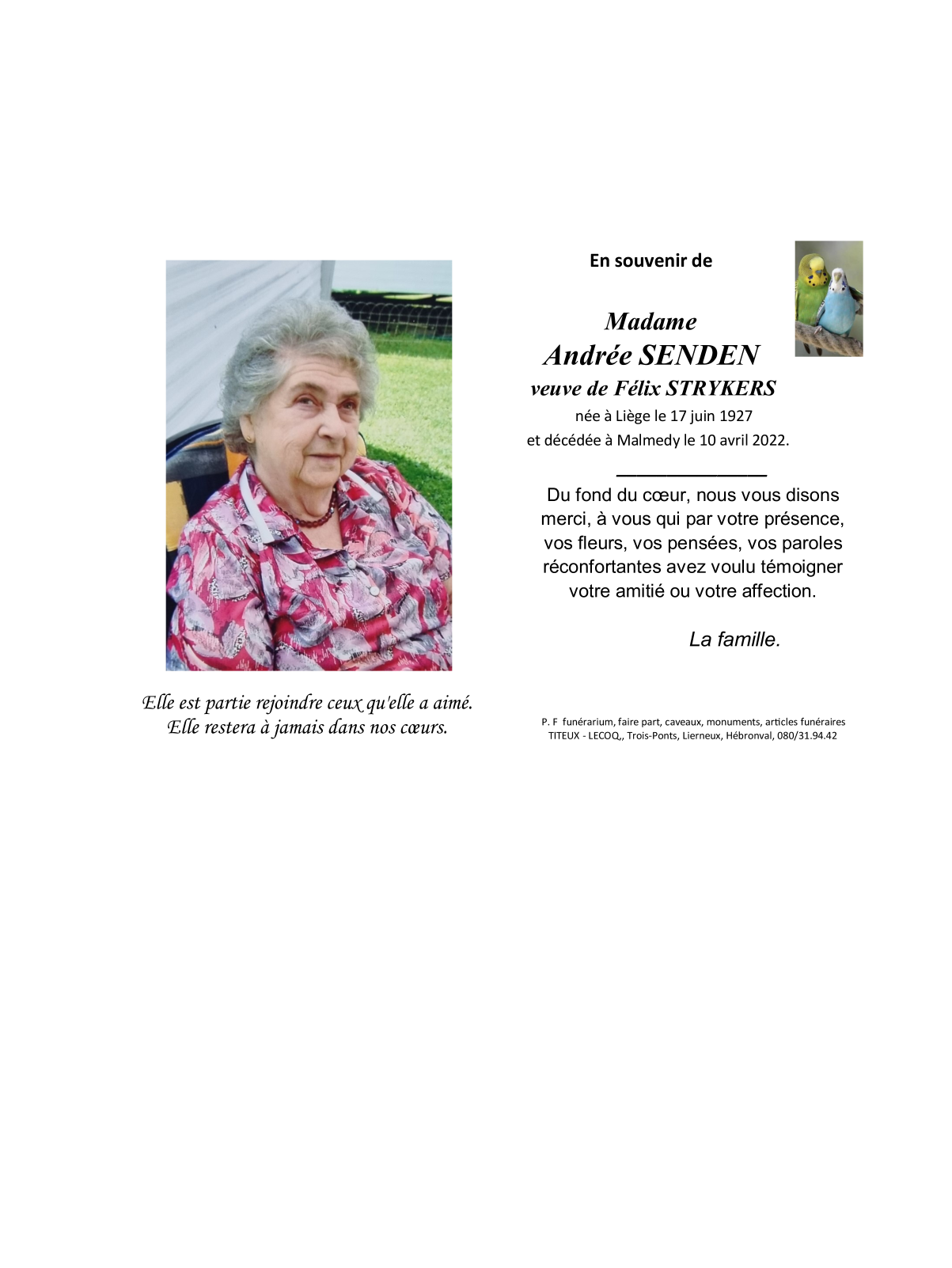Décédée à Malmedy (4960) le dimanche 10 avril 2022 à l'âge de 94 ans