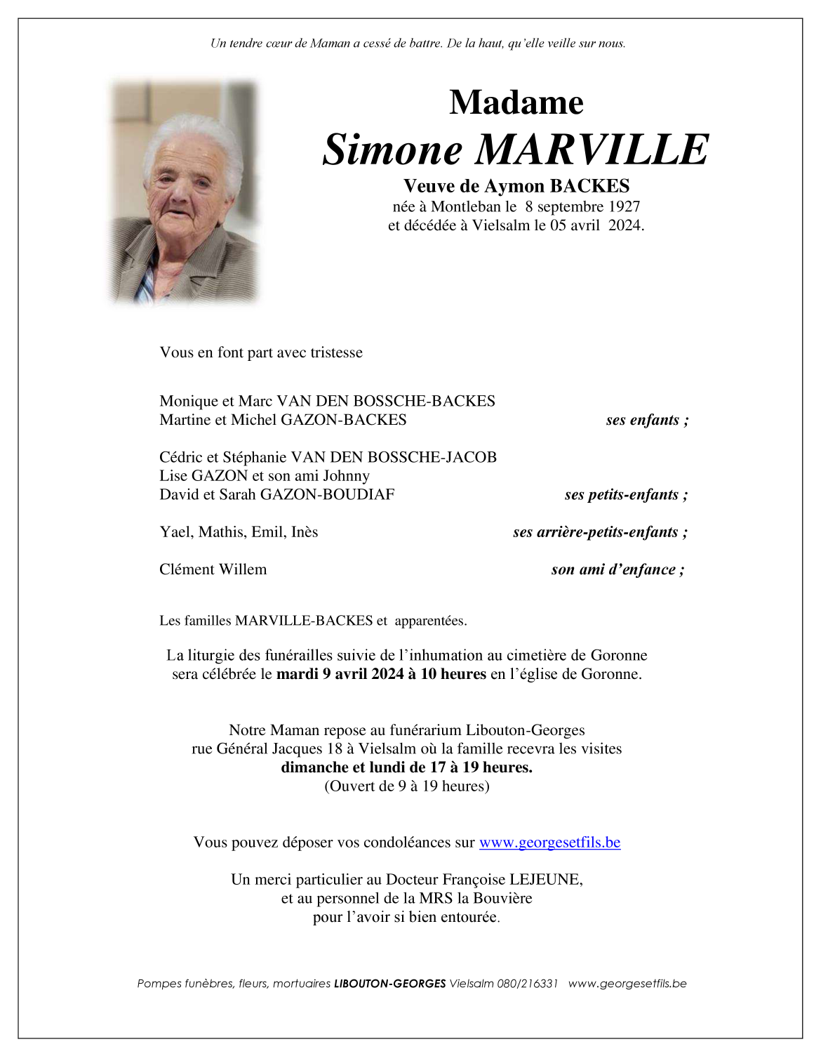 Overleden te Vielsalm (6690) op vrijdag 5 april 2024 op 96-jarige leeftijd