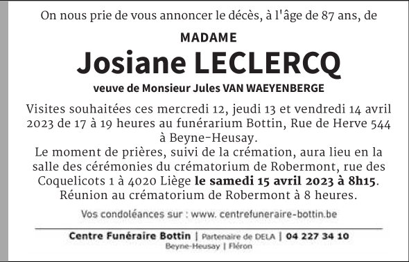 Died in Hermalle-sous-Argenteau (4681) on 08 April 2023 at the age of 87 years