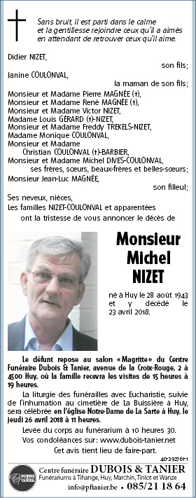 Overleden te Huy (4500) op maandag 23 april 2018 op 74-jarige leeftijd