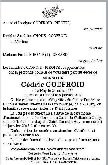 Fallecido en Dinant (5500) el viernes, 6 de enero de 2017 a la edad de 37 años