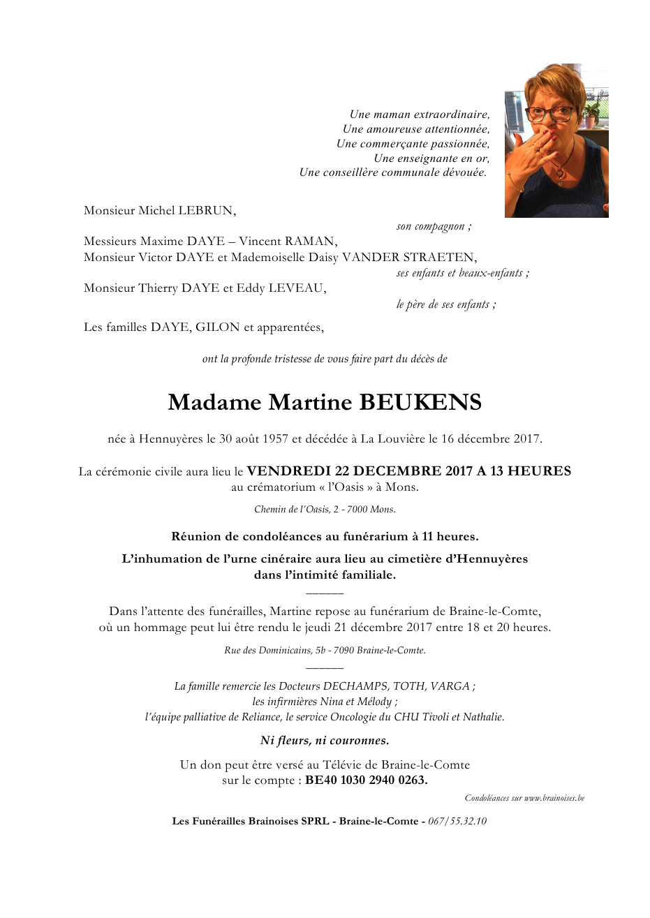 Décédée à La Louvière (7100) le samedi 16 décembre 2017 à l'âge de 60 ans