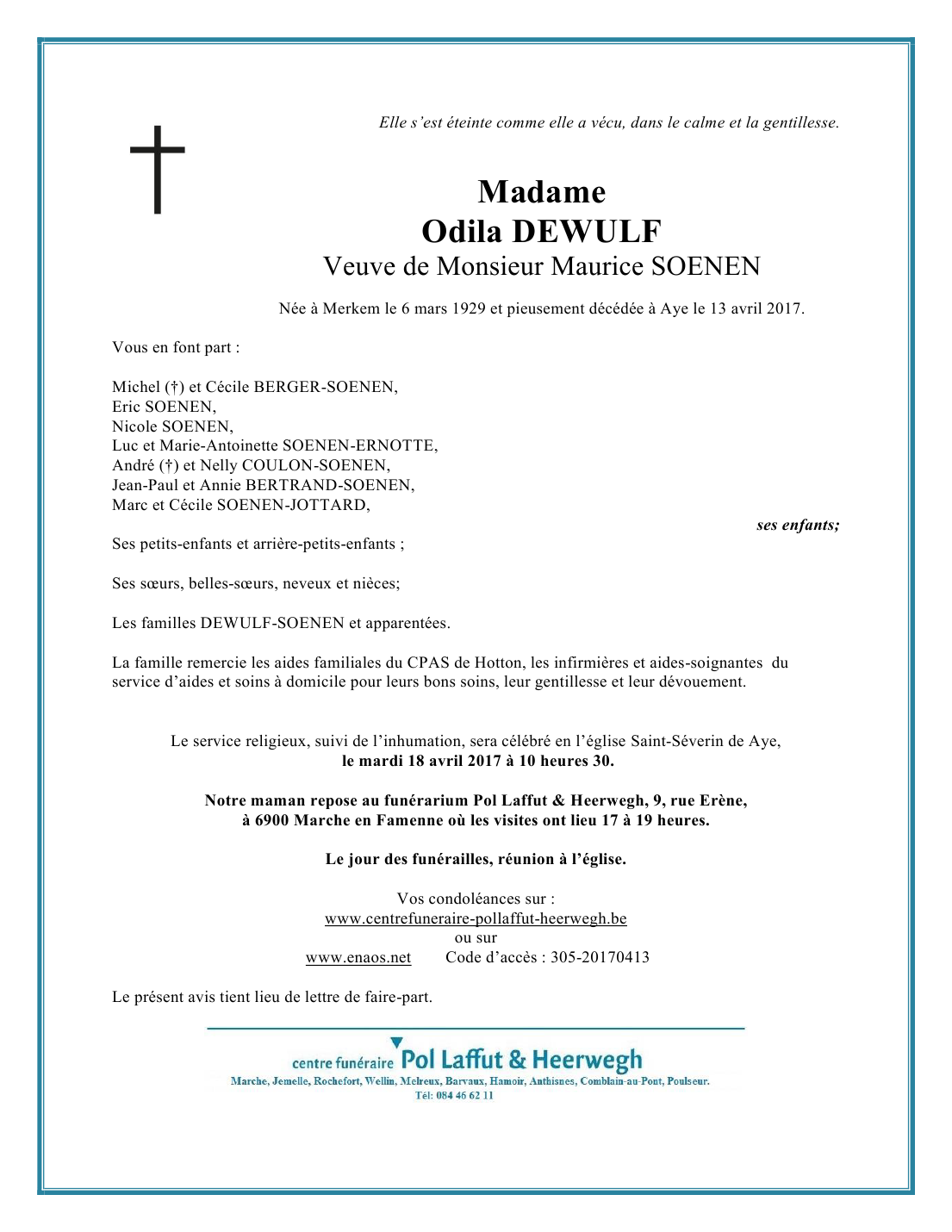 Overleden te Aye (6900) op donderdag 13 april 2017 op 88-jarige leeftijd