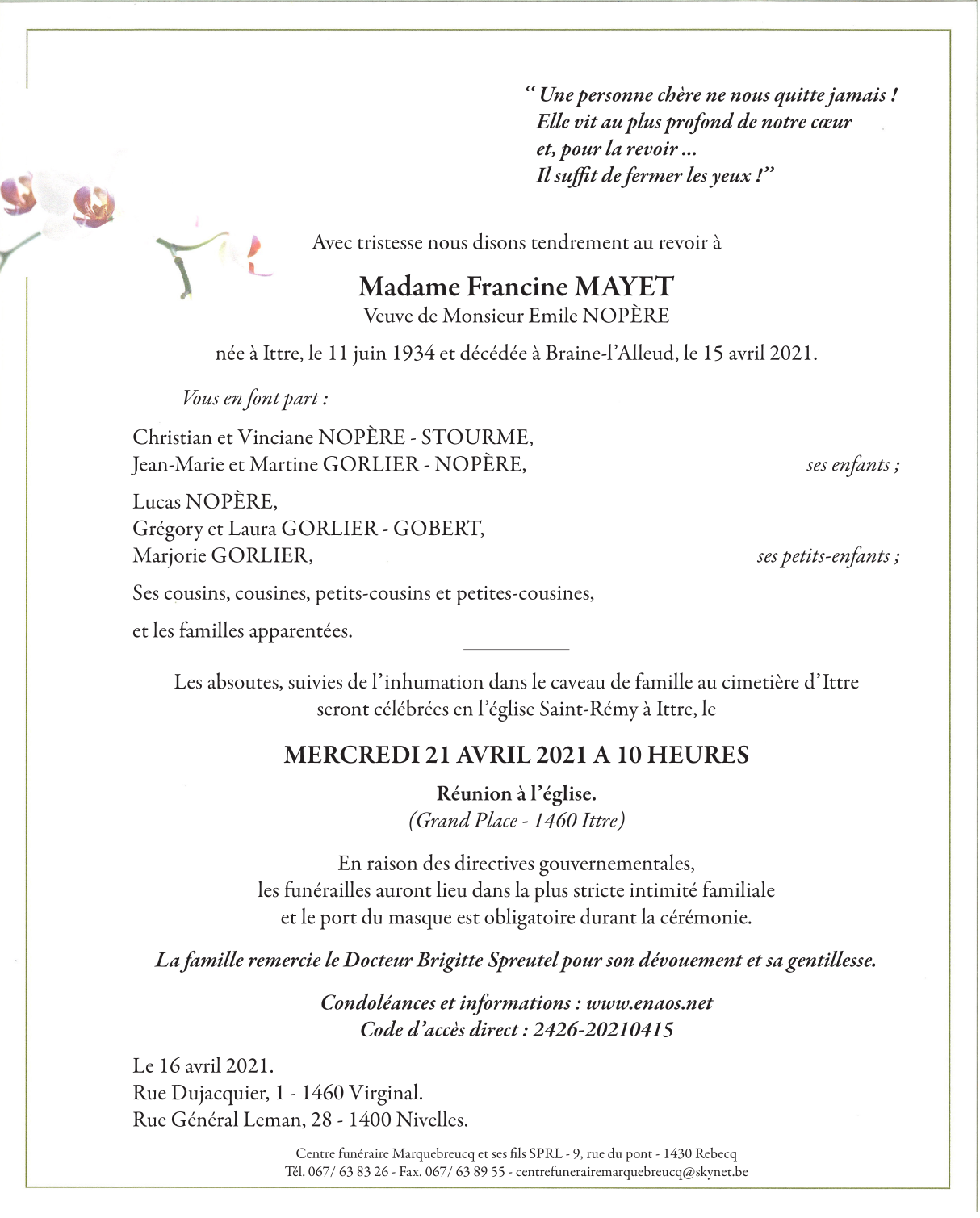 Décédée à Braine-l'Alleud (1420) le jeudi 15 avril 2021 à l'âge de 86 ans
