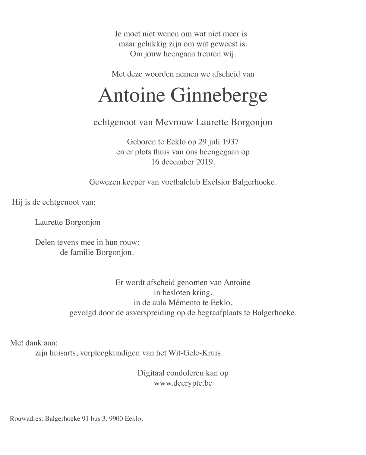 Décédé à Eeklo (9900) le lundi 16 décembre 2019 à l'âge de 82 ans