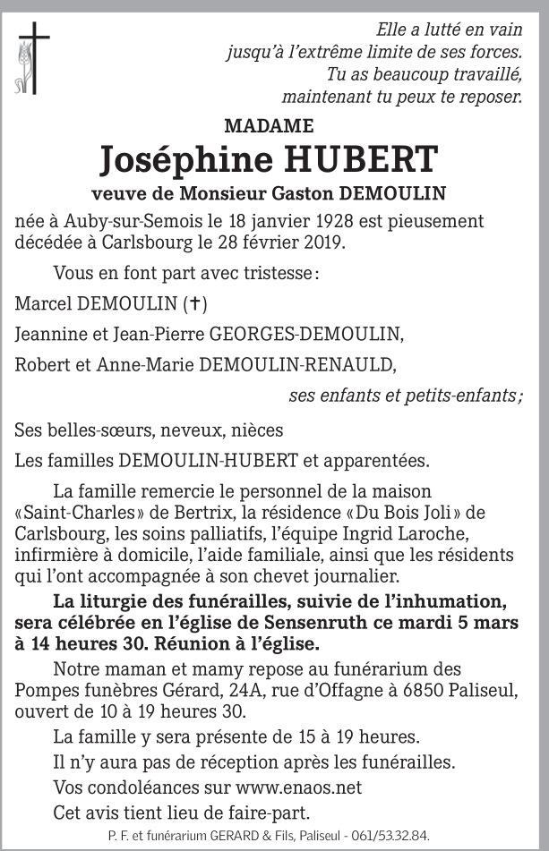 Décédée à Carlsbourg (6850) le jeudi 28 février 2019 à l'âge de 91 ans