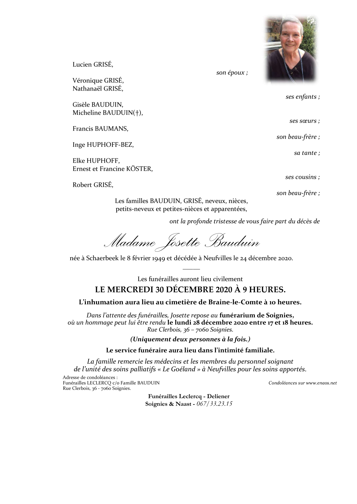 Décédée à Neufvilles (7063) le jeudi 24 décembre 2020 à l'âge de 71 ans