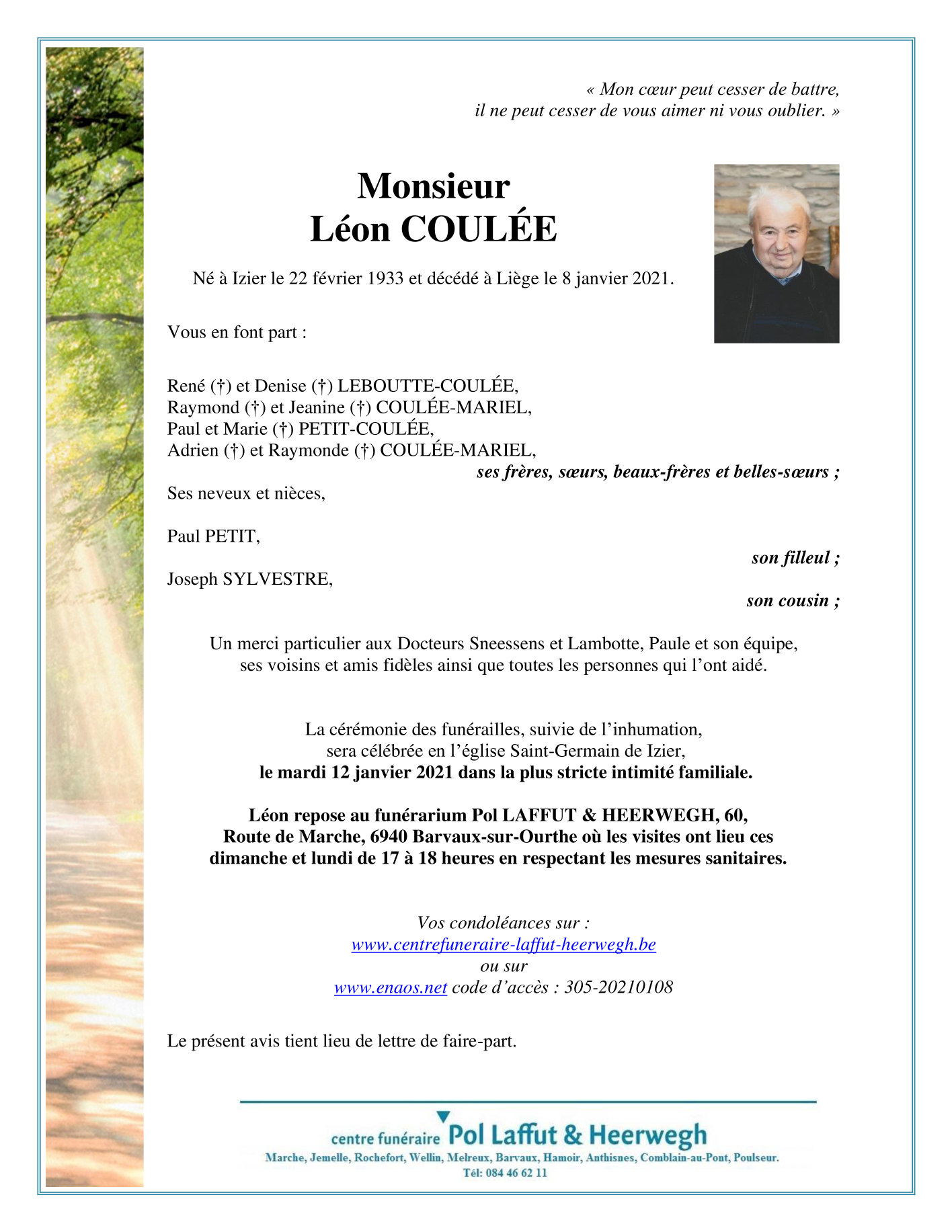 Décédé à Liège (4000) le vendredi 8 janvier 2021 à l'âge de 87 ans