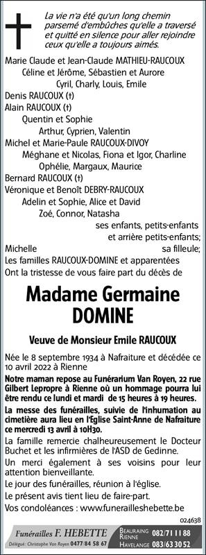 Fallecida en Rienne (5575) el domingo, 10 de abril de 2022 a la edad de 87 años