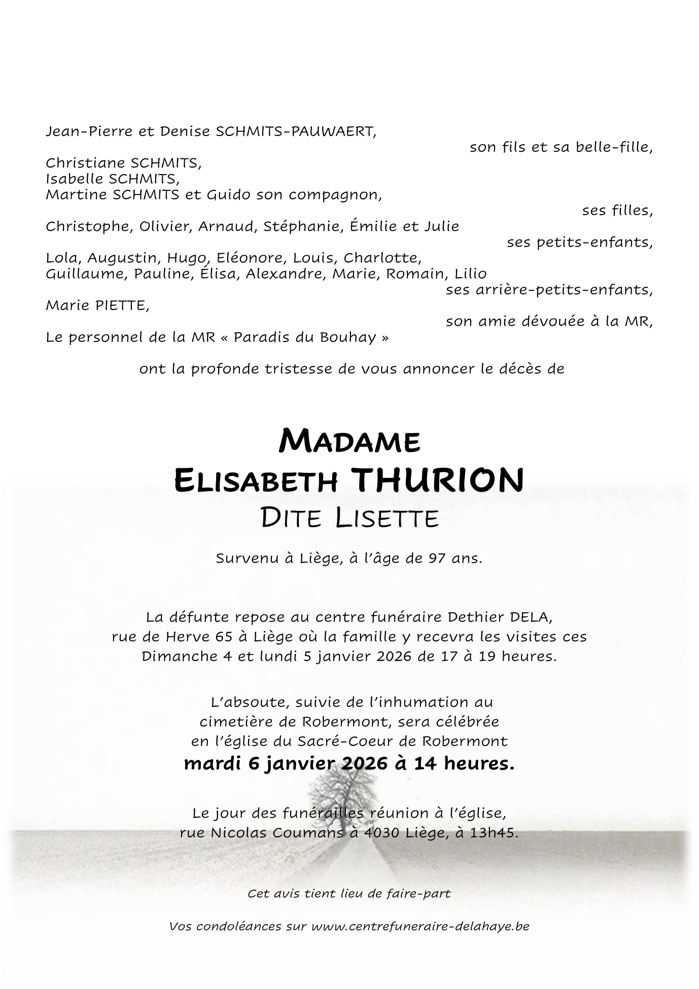 Décédée à Liège (4020) le dimanche 21 décembre 2025 à l'âge de 97 ans