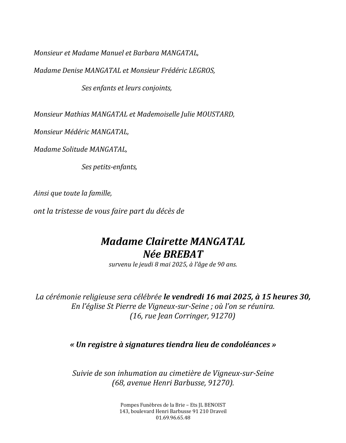 Madame Belonie MANGATAL née BREBAT