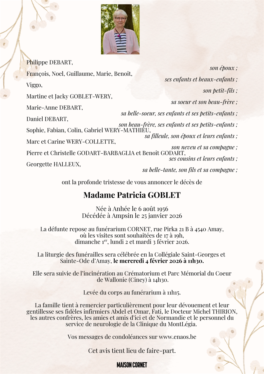 Décédée à Ampsin (4540) le dimanche 25 janvier 2026 à l'âge de 69 ans