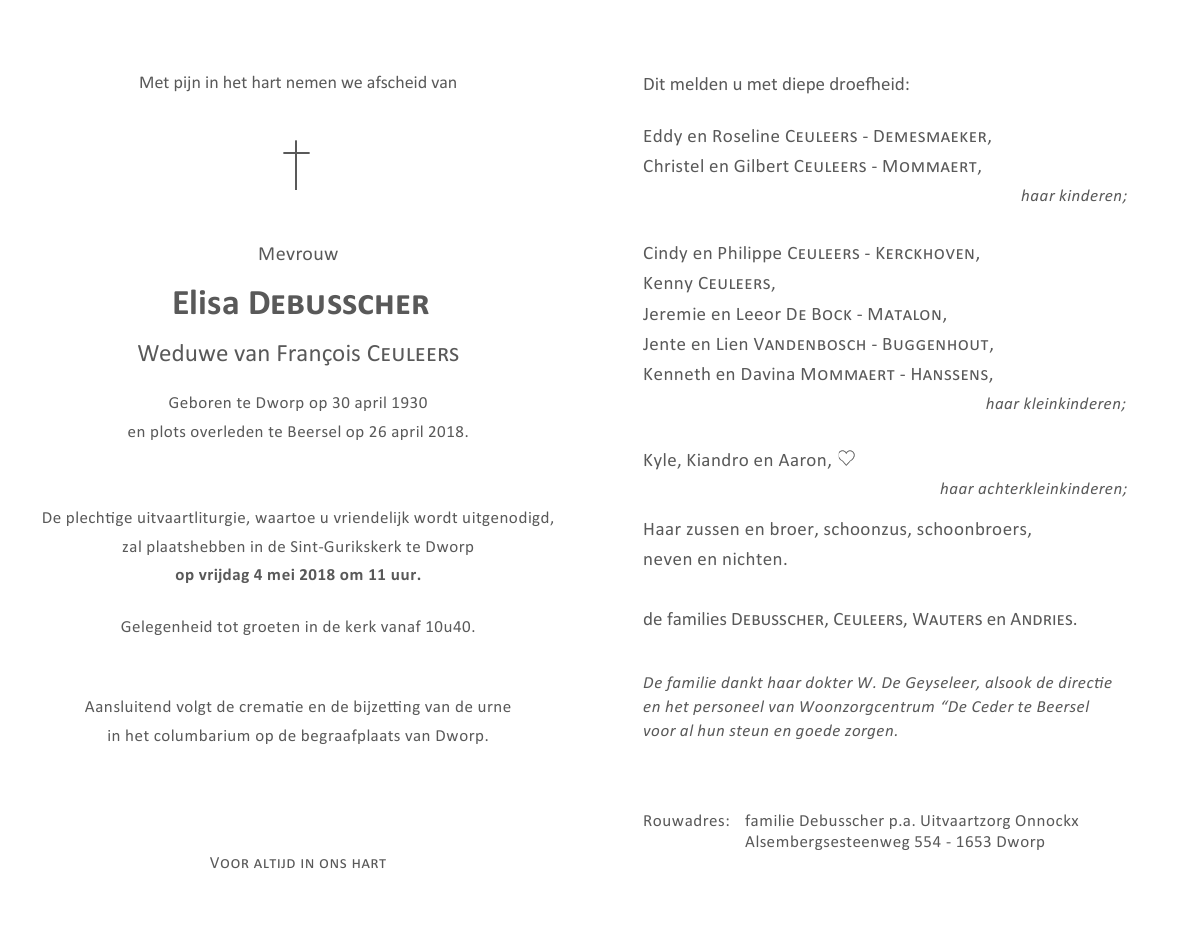 Fallecida en Beersel (1650) el jueves, 26 de abril de 2018 a la edad de 87 años