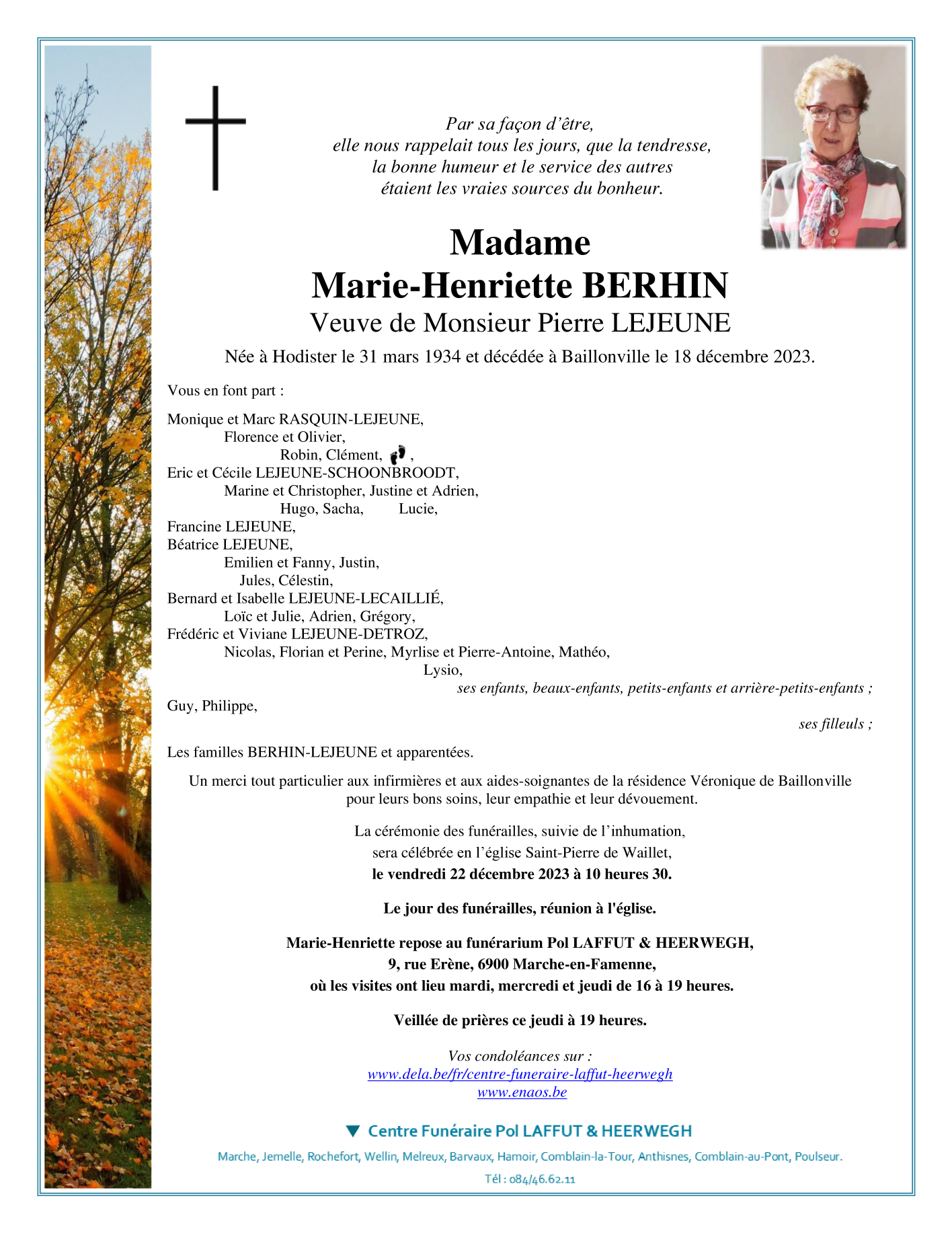 Décédée à Baillonville (5377) le mardi 19 décembre 2023 à l'âge de 89 ans