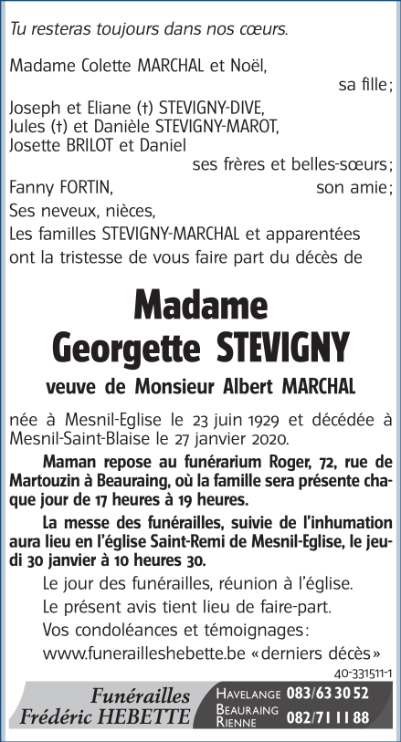 Fallecida en Mesnil-Saint-Blaise (5560) el lunes, 27 de enero de 2020 a la edad de 90 años
