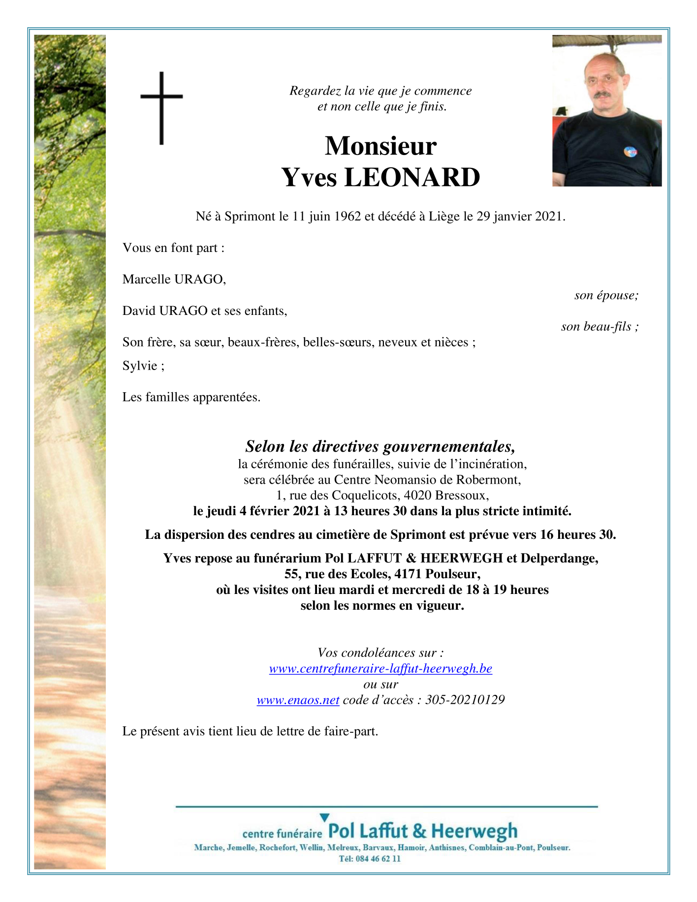 Décédé à Liège (4000) le vendredi 29 janvier 2021 à l'âge de 58 ans