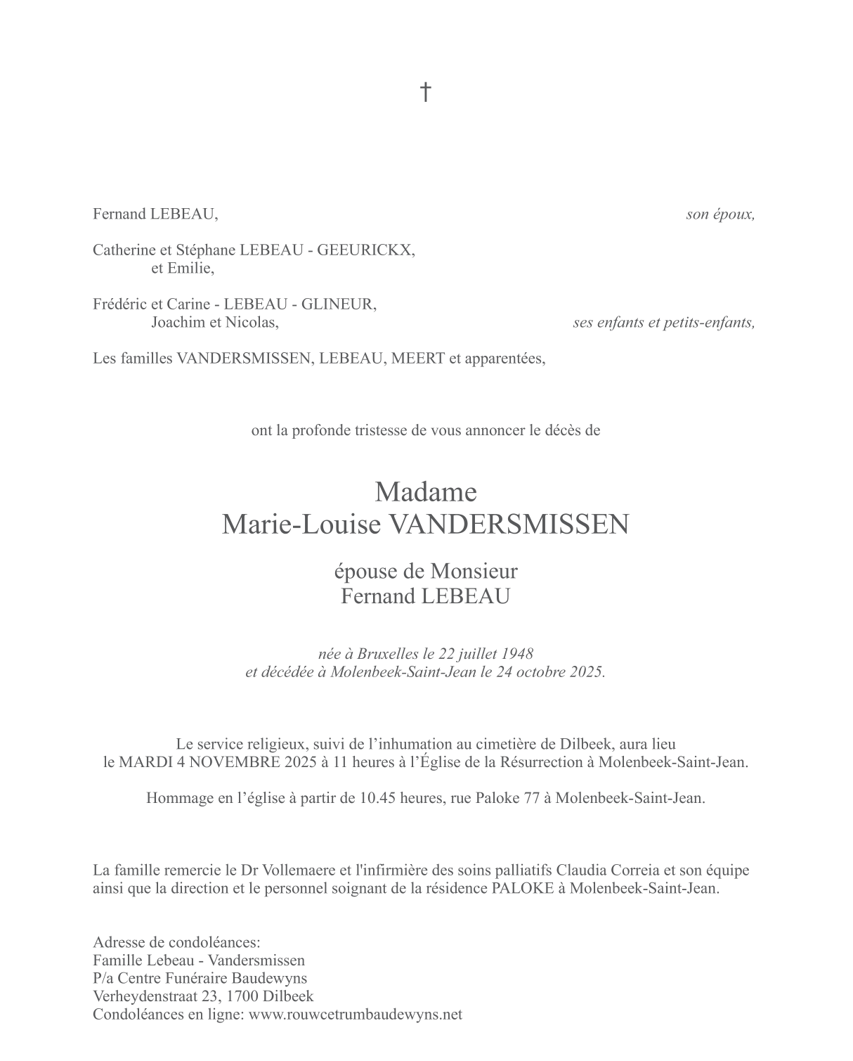 Fallecida en Molenbeek-Saint-Jean (1080) el viernes, 24 de octubre de 2025 a la edad de 77 años