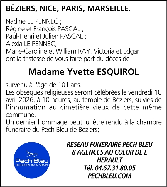 Décédée à Béziers (34500, France) le lundi 6 avril 2026 à l'âge de 101 ans