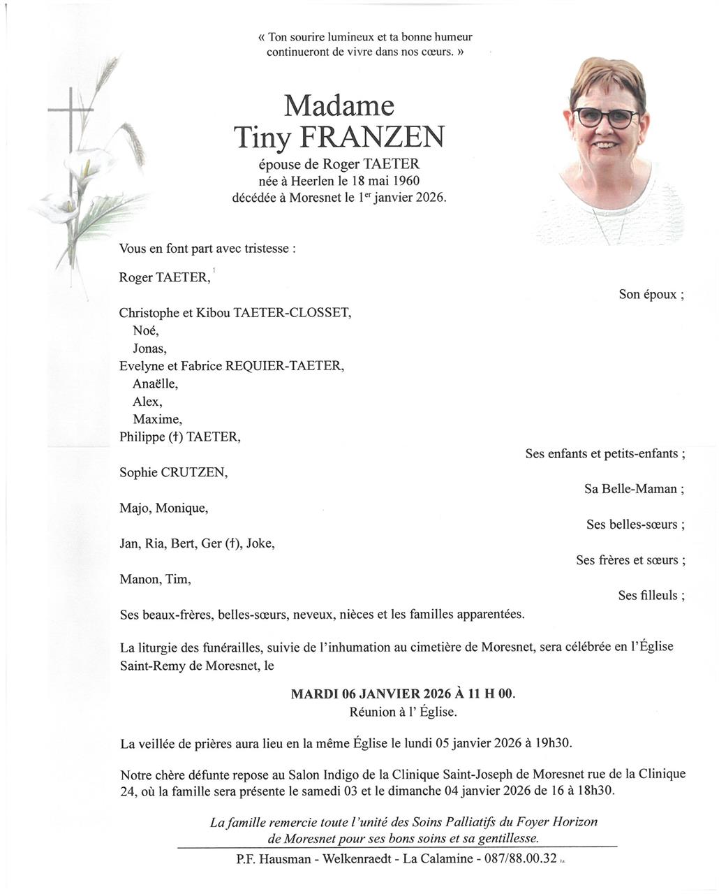 Décédée à Moresnet (4850) le jeudi 1 janvier 2026 à l'âge de 65 ans