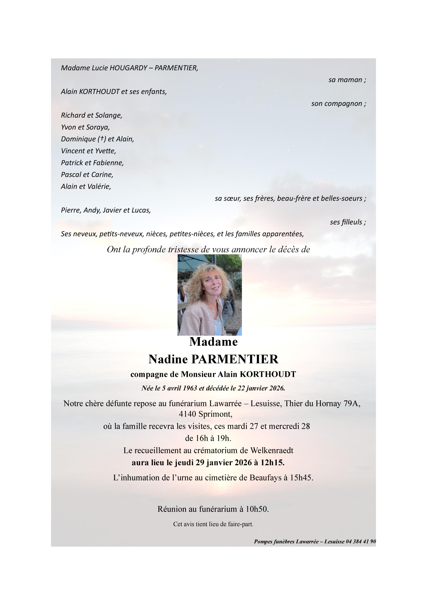 Décédée à Sprimont (4140) le jeudi 22 janvier 2026 à l'âge de 62 ans