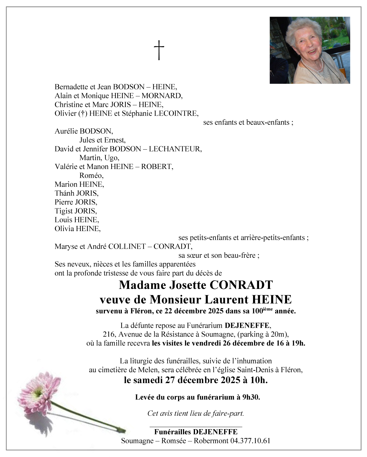 Décédée à Fléron (4620) le lundi 22 décembre 2025 à l'âge de 99 ans