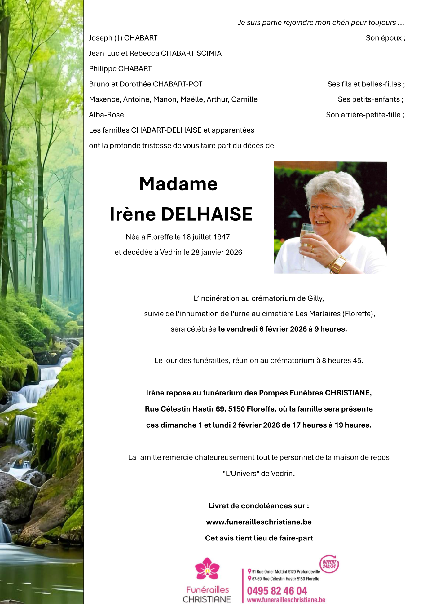 Décédée à Vedrin (5020) le mercredi 28 janvier 2026 à l'âge de 78 ans